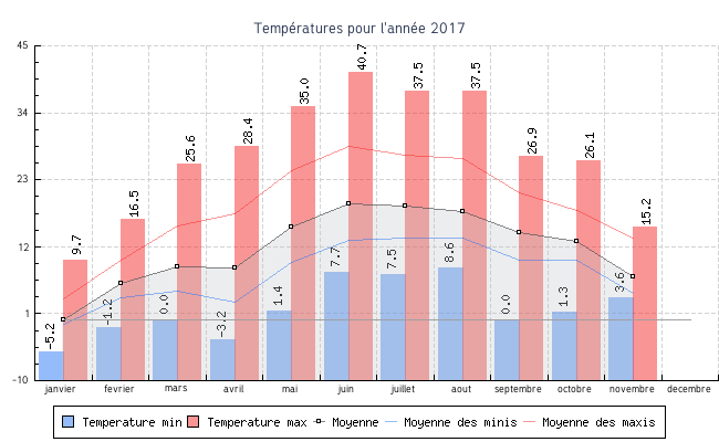 | janvier | -5.2 °C | -0.8 °C | 9.7 °C | 3.5 °C | 0.0 °C | 2.9 km/h | 24.8 km/h | SSO |