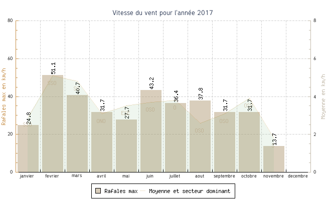 | fevrier | -1.2 °C | 3.6 °C | 16.5 °C | 9.7 °C | 5.9 °C | 5.1 km/h | 51.1 km/h | SSO |